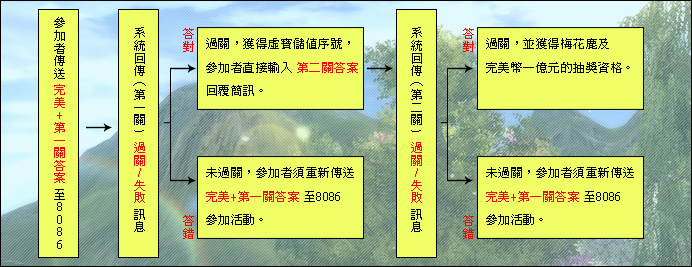 使用簡訊編輯「完美+第一關1~6題順序之答案代碼」發送至8086全數答對者立即可獲得 志玲的祝福*3,