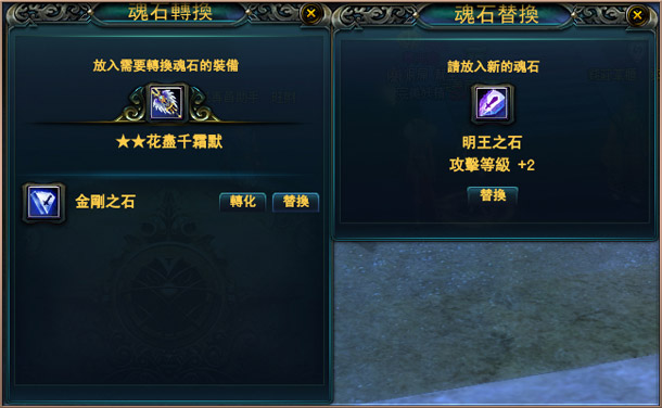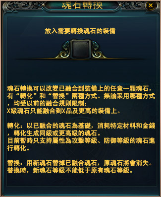 替換裝備上的單顆魂石,只能用同級或更高等級的魂石進行,新的魂石將直接替換掉已鑲嵌在裝備上的舊魂石,舊魂石會隨之消失,所以玩家也要謹慎操作,選擇自己所需進行替換。