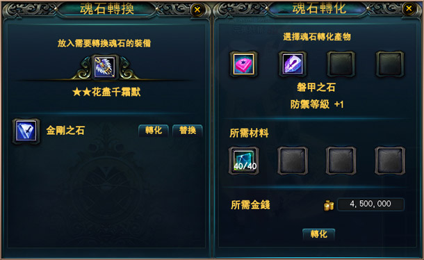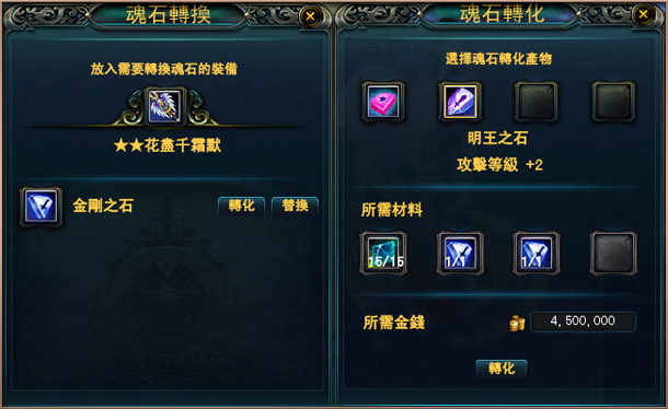 從前玩家想要替換裝備上的魂石,只能把此裝備上已鑲嵌的所有魂石全部清除,才能重新鑲嵌。四個魂石中想要替換一個,就要花四個魂石的價錢,成本極高,又很不方便。全新魂石轉換系統,允許玩家對裝備上已鑲嵌的魂石進行單顆操作,想換哪顆換哪顆,從此再不用為魂石搭配擔心了!