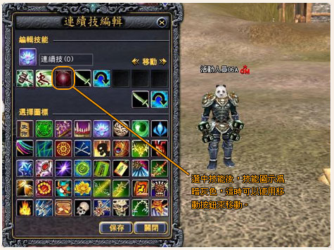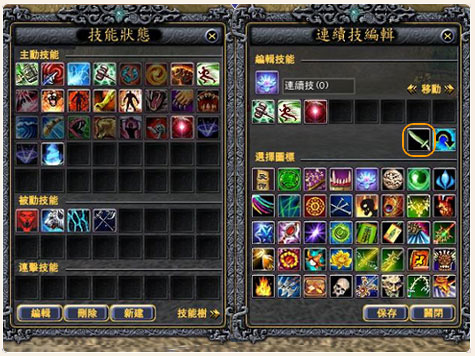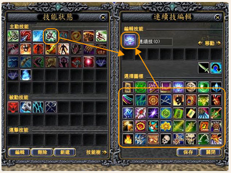 首先在選擇圖示欄選擇一個連擊技能圖示,再將要施放的技能 ( 只能為主動技能 ) 拖移到
